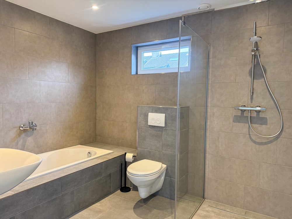 Hal, Toilet, Woonkamer met openkeuken, Wasruimte met toegang tot de achtertuin, 1e Slaapkamer met openslaande deuren, 1e badkamer met zowel bad als douche en toilet