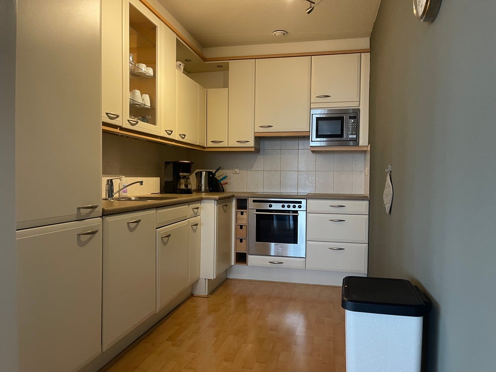Entree, hal, lichte woonkamer met inpandig balkon. Semi open keuken welke is voorzien van diverse inbouwapparatuur.