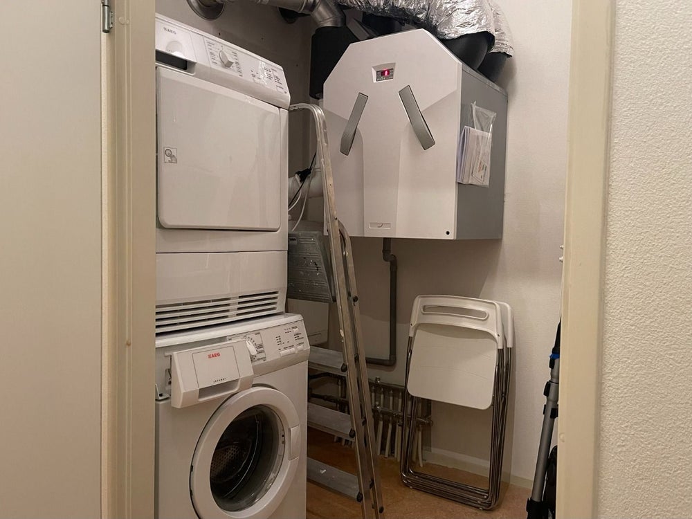 Berging met wasmachine, droger en kastruimte. Separaat toilet.